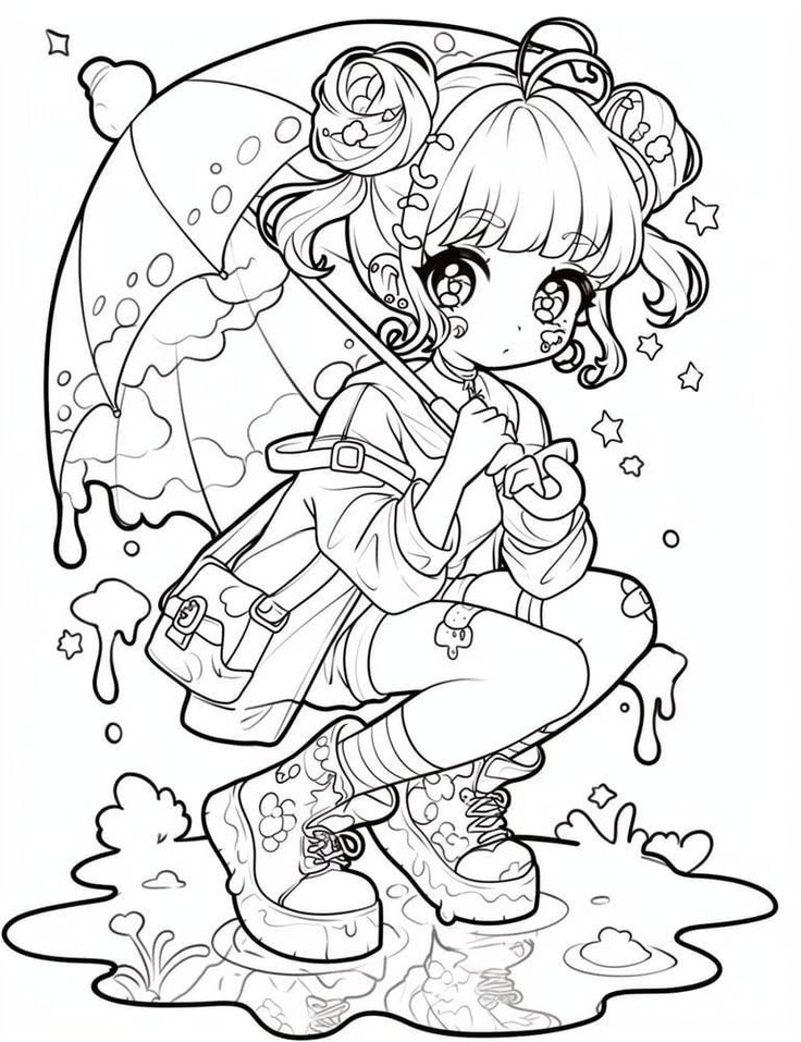 Аниме девочка с зонтиком детальная раскраска