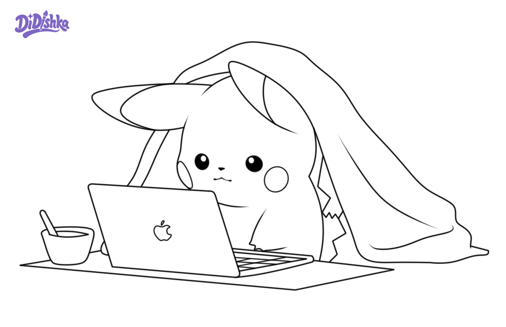 Пикачу за ноутбуком раскраска для детей