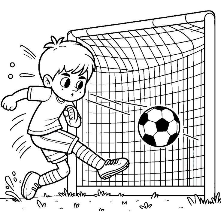 Мальчик забивает футбольный мяч в ворота