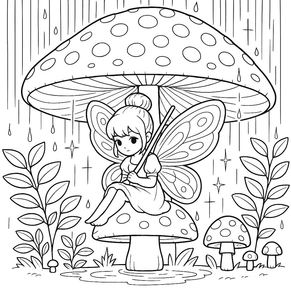 Фея прячется от дождя под грибом