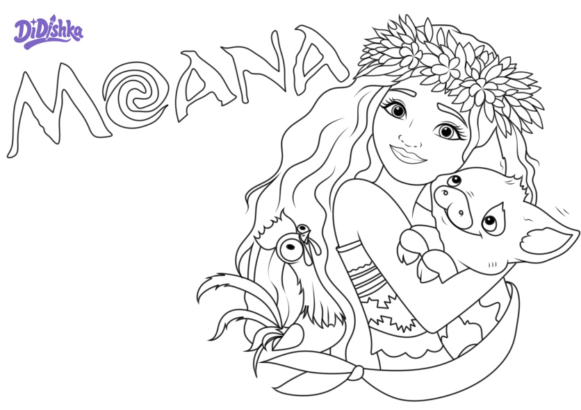 Моана с Пуа и Хей-хей раскраска